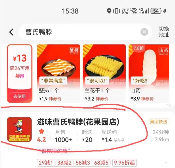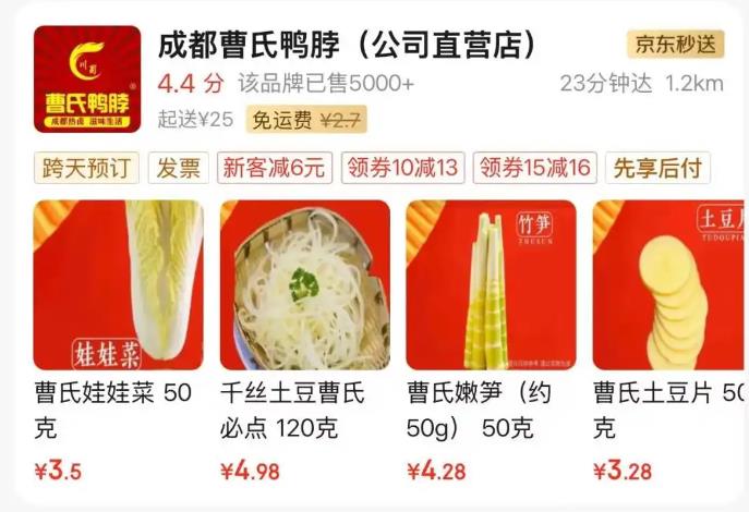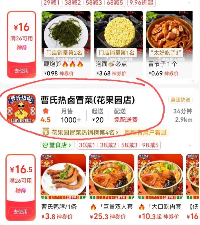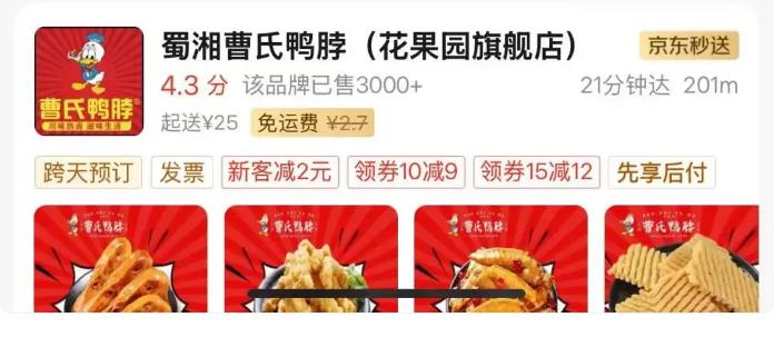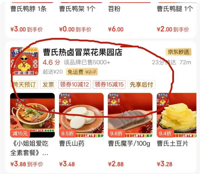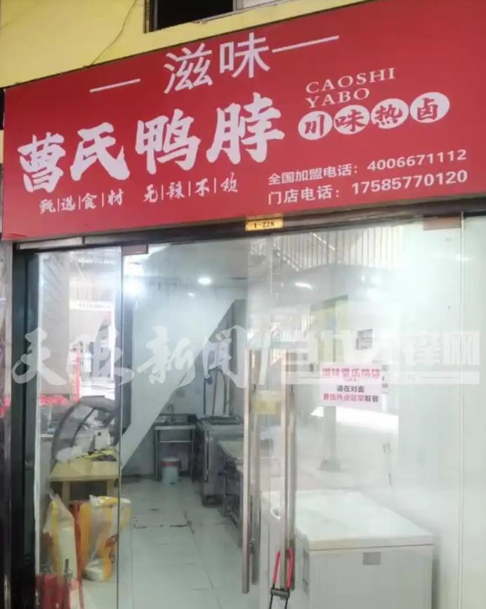 在花果园附近搜索外卖“曹氏鸭脖”可以看到有两家名为“滋味曹氏鸭脖(花果园店)”和“曹氏热卤冒菜(花果园店)”的店铺,记者按照其中一家的地址来到现场发现,“滋味曹氏鸭脖”的店面玻璃上张贴着“滋味曹氏鸭脖请在对面曹氏热卤冒菜取餐”的字样。
